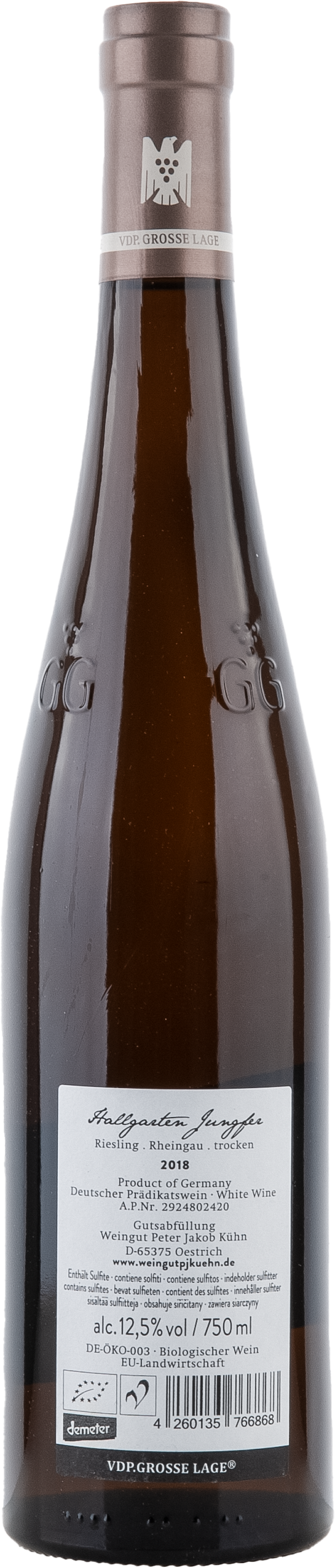 Kühns Teil der Hallgartener Jungfer liegt direkt oberhalb vom Doosberg auf rund 220 Metern Seehöhe. Der Boden ist Abtragungsmaterial vom Rheingaugebirge mit einem hohen Quarzitanteil, vermischt mit Lösslehm. Leicht nach Südost geneigt, ist der Weinberg etwas kühler als der Doosberg. Der Ausbau dieses Großen Gewächses erfolgte im eigens angeschafften Stockinger Holzfass. Der Wein aus der Hallgartener Jungfer liegt jedes Jahr in demselben Fass, wodurch der Holzeinfluss kaum noch spürbar ist.