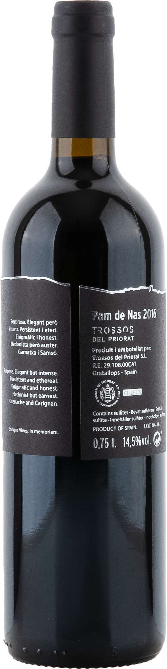 Trossos del Priorat findet in dieser Cuvée die Quintessenz ihres Terroirs. Pam de Nas ist tiefdunkel in der Nase. Absolut dicht und intensiv, ohne ein Gefühl von Schwere zu vermitteln. Rote Johannisbeeren, Cassis, Holunderbeeren sowie Brombeere stehen auf der einen Seite. Dem gegenüber bäumen sich grüne Walnüsse, schwarze Oliven, Kakaobutter und dunkle Schokolade auf. Ein wenig Leder, Akazienholz und Wacholder unterstützen dies gewaltig. Mandelblüte sowie auch geröstete Mandeln und mediterrane Gewürze sorgen für den krönenden Abschluss.
