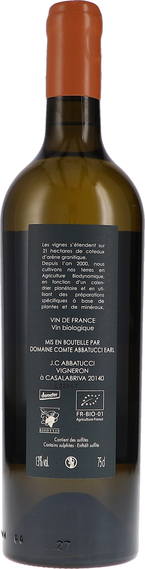 Für die zweite weiße Cuvée der Collection hat Jean-Charles Abbatucci fünf autochthone Sorten mit Vermentinu assembliert: Rossola Brandinca, Riminese, Carcaghjolo Bianco, Biancone und Paga Debbiti. Vielfältiger Duft von Kräutern und Wildblumen wie Kamille,