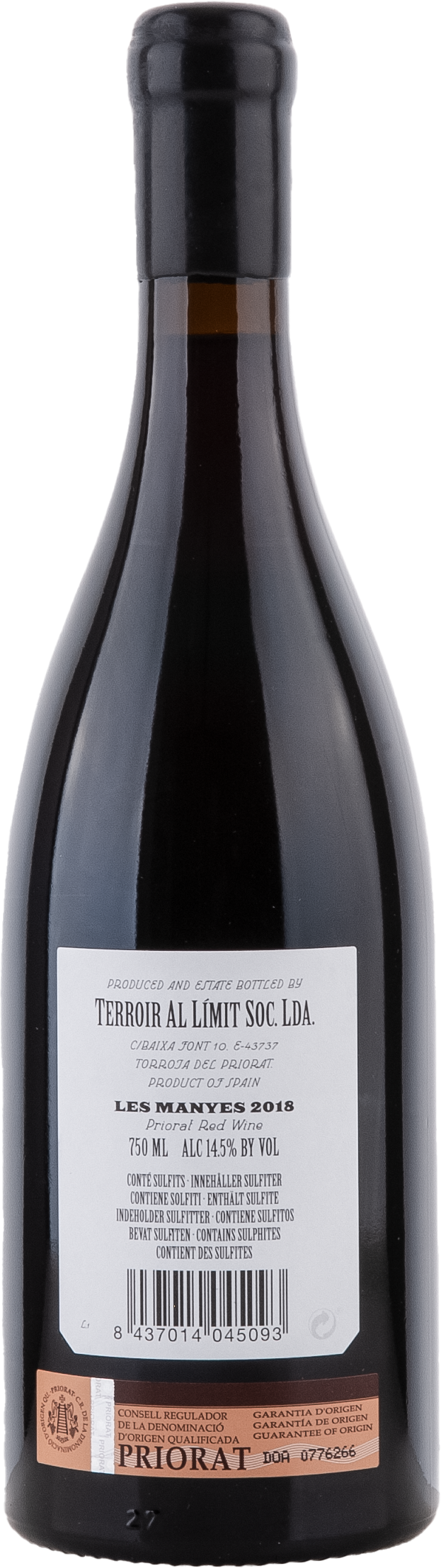 Auf dem Etikett steht über Les Manyes Vi d´altura. Das bedeutet aus dem katalanischen übersetzt. Wein aus der Höhe. Dieser reinsortige Grenache kommt aus einer 1,5ha großen Parzelle am nördlichen Ende des Priorat am Fuße des Montsant-Berges auf ca. 800 Höhenmetern. Dort stehen die 70,75--jährigen Reben auf einem Plateau aus Argile (Lehm & Ton) und wirken zunächst völlig unspektakulär. Um genau zu sein, ist es eine Mutation namens Garnacha Peluda, die einen leichten Flaum auf den Beeren aufweist. Seit dem Jahrgang 2016 ist Dominik Huber für den Les Manyes völlig weg gekommen vom Holz. Zu 100% wird dieser Wein im Zementtank ausgebaut. Er selbst sagt, dass dies der beste Wein ist, der von Terroir al Limit bis dato gemacht wurde.
